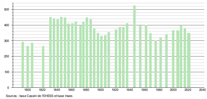 L'évolution du nombre d'habitants est connue à travers les recensements de la population effectués dans la commune depuis 1793. Pour les communes de moins de 10 000 habitants, une enquête de recensement portant sur toute la population est réalisée tous les cinq ans, les populations légales des années intermédiaires étant quant à elles estimées par interpolation ou extrapolation[20]. Pour la commune, le premier recensement exhaustif entrant dans le cadre du nouveau dispositif a été réalisé en 2005[21].