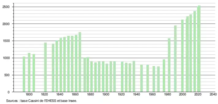 L'évolution du nombre d'habitants est connue à travers les recensements de la population effectués dans la commune depuis 1793. Pour les communes de moins de 10 000 habitants, une enquête de recensement portant sur toute la population est réalisée tous les cinq ans, les populations légales des années intermédiaires étant quant à elles estimées par interpolation ou extrapolation[33]. Pour la commune, le premier recensement exhaustif entrant dans le cadre du nouveau dispositif a été réalisé en 2005[34].
