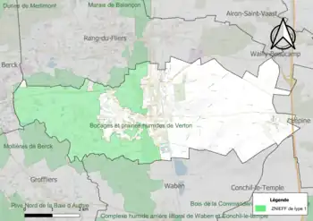 Le territoire communal comprend quatre ZNIEFF de type 1[Note 2] : les bocages et prairies humides de Verton. Complexe bocager humide tout à fait original associant prairies mésotrophiles à eutrophiles de différents niveaux topographiques avec des mares et des chenaux de drainage[14]
