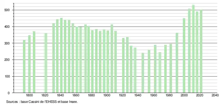 L'évolution du nombre d'habitants est connue à travers les recensements de la population effectués dans la commune depuis 1793. Pour les communes de moins de 10 000 habitants, une enquête de recensement portant sur toute la population est réalisée tous les cinq ans, les populations légales des années intermédiaires étant quant à elles estimées par interpolation ou extrapolation[17]. Pour la commune, le premier recensement exhaustif entrant dans le cadre du nouveau dispositif a été réalisé en 2006[18].