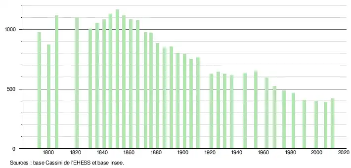 - Dans le tableau des recensements et le graphique, par convention dans Wikipédia, le principe a été retenu, pour les populations légales postérieures à 1999 de n’afficher dans le tableau des recensements et le graphique que les populations correspondant à l'année 2006, première population légale publiée calculée conformément aux concepts définis dans le décret no 2003-485 du 5 juin 2003, et les années correspondant à une enquête exhaustive de recensement pour les communes de moins de 10 000 habitants, ainsi que la dernière population légale publiée par l’Insee.