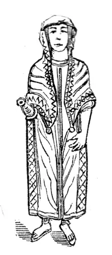 Leur costume comprend une longue robe (stola)[72] et des bandelettes pour retenir la chevelure (vittae), typiques des matrones romaines[73]. Ces deux éléments appartiennent à la garde-robe traditionnelle de la matrone romaine[74].