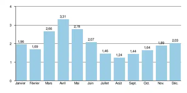 | 2008 | 1.89 | 5.01 (avril) | 14.7 (22 avril) | 33.1 (12 août) | |||