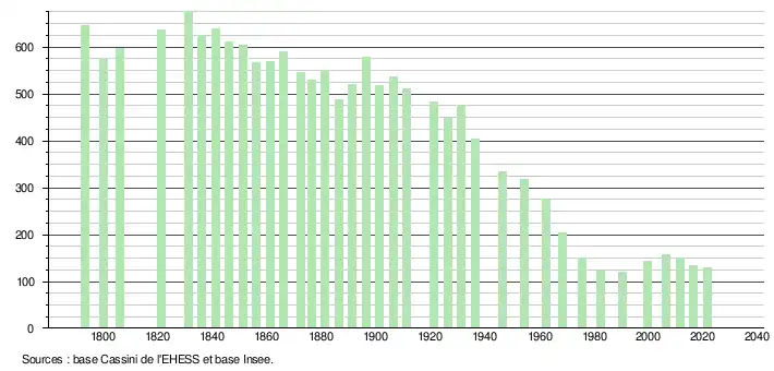 L'évolution du nombre d'habitants est connue à travers les recensements de la population effectués dans la commune depuis 1793. Pour les communes de moins de 10 000 habitants, une enquête de recensement portant sur toute la population est réalisée tous les cinq ans, les populations légales des années intermédiaires étant quant à elles estimées par interpolation ou extrapolation[14]. Pour la commune, le premier recensement exhaustif entrant dans le cadre du nouveau dispositif a été réalisé en 2006[15].