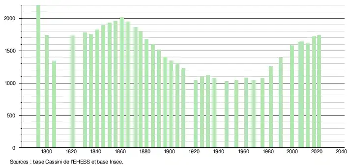 L'évolution du nombre d'habitants est connue à travers les recensements de la population effectués dans la commune depuis 1793. Pour les communes de moins de 10 000 habitants, une enquête de recensement portant sur toute la population est réalisée tous les cinq ans, les populations légales des années intermédiaires étant quant à elles estimées par interpolation ou extrapolation[24]. Pour la commune, le premier recensement exhaustif entrant dans le cadre du nouveau dispositif a été réalisé en 2007[25].