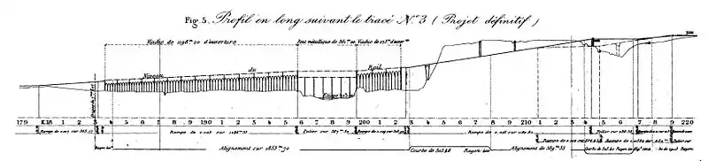 Le niveau de la plate-forme sur le tablier métallique n'était encore qu'à la cote 134,30, mais le remblai à la suite était, sur 140 mètres, en pente de 0,01, et sur le reste de la longueur, en rampe de 0,016. La profondeur maximum de la tranchée ouverte dans le coteau de rive droite dépassait néanmoins 13 mètres.