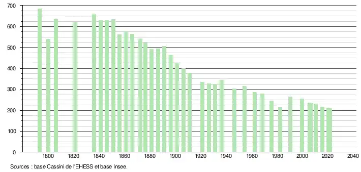 L'évolution du nombre d'habitants est connue à travers les recensements de la population effectués dans la commune depuis 1793. Pour les communes de moins de 10 000 habitants, une enquête de recensement portant sur toute la population est réalisée tous les cinq ans, les populations légales des années intermédiaires étant quant à elles estimées par interpolation ou extrapolation[16]. Pour la commune, le premier recensement exhaustif entrant dans le cadre du nouveau dispositif a été réalisé en 2005[17].