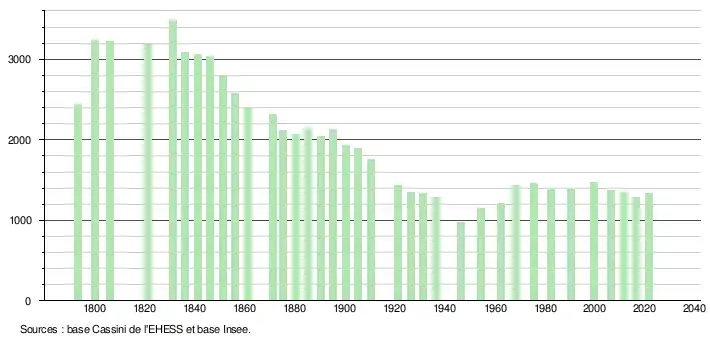 L'évolution du nombre d'habitants est connue à travers les recensements de la population effectués dans la commune depuis 1793. Pour les communes de moins de 10 000 habitants, une enquête de recensement portant sur toute la population est réalisée tous les cinq ans, les populations légales des années intermédiaires étant quant à elles estimées par interpolation ou extrapolation[25]. Pour la commune, le premier recensement exhaustif entrant dans le cadre du nouveau dispositif a été réalisé en 2006[26].