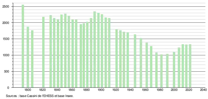 L'évolution du nombre d'habitants est connue à travers les recensements de la population effectués dans la commune depuis 1793. Pour les communes de moins de 10 000 habitants, une enquête de recensement portant sur toute la population est réalisée tous les cinq ans, les populations légales des années intermédiaires étant quant à elles estimées par interpolation ou extrapolation[22]. Pour la commune, le premier recensement exhaustif entrant dans le cadre du nouveau dispositif a été réalisé en 2006[23].