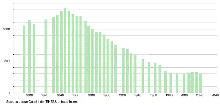 L'évolution du nombre d'habitants est connue à travers les recensements de la population effectués dans la commune depuis 1793. Pour les communes de moins de 10 000 habitants, une enquête de recensement portant sur toute la population est réalisée tous les cinq ans, les populations légales des années intermédiaires étant quant à elles estimées par interpolation ou extrapolation[24]. Pour la commune, le premier recensement exhaustif entrant dans le cadre du nouveau dispositif a été réalisé en 2005[25].