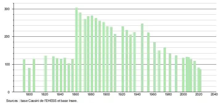 L'évolution du nombre d'habitants est connue à travers les recensements de la population effectués dans la commune depuis 1793. Pour les communes de moins de 10 000 habitants, une enquête de recensement portant sur toute la population est réalisée tous les cinq ans, les populations légales des années intermédiaires étant quant à elles estimées par interpolation ou extrapolation[27]. Pour la commune, le premier recensement exhaustif entrant dans le cadre du nouveau dispositif a été réalisé en 2004[28].