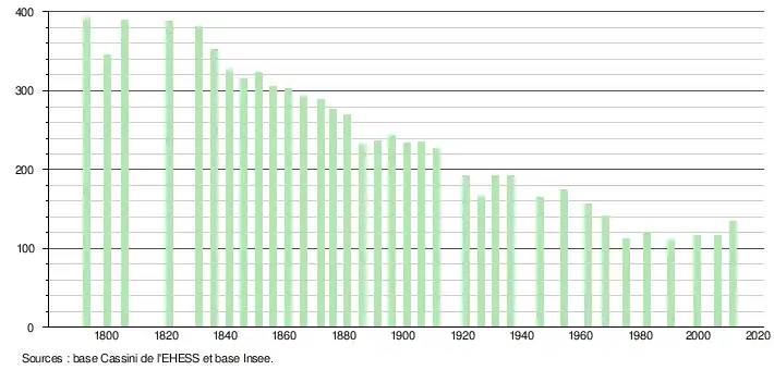 - Dans le tableau des recensements et le graphique, par convention dans Wikipédia, le principe a été retenu, pour les populations légales postérieures à 1999 de n’afficher dans le tableau des recensements et le graphique que les populations correspondant à l'année 2006, première population légale publiée calculée conformément aux concepts définis dans le décret no 2003-485 du 5 juin 2003, et les années correspondant à une enquête exhaustive de recensement pour les communes de moins de 10 000 habitants, ainsi que la dernière population légale publiée par l’Insee.
