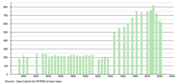 L'évolution du nombre d'habitants est connue à travers les recensements de la population effectués dans la commune depuis 1793. Pour les communes de moins de 10 000 habitants, une enquête de recensement portant sur toute la population est réalisée tous les cinq ans, les populations légales des années intermédiaires étant quant à elles estimées par interpolation ou extrapolation[17]. Pour la commune, le premier recensement exhaustif entrant dans le cadre du nouveau dispositif a été réalisé en 2004[18].
