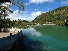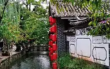 La vieille ville de Lijiang est irriguée par un cours d'eau provenant du Heilongtan (黑龙潭, Bassin du Dragon Noir), lac d'une superficie de 40 000 m2 où se rassemblent les eaux de plusieurs dizaines de sources de montagne. À l'entrée de la ville, celui-ci se sépare en trois branches, les fleuves de l'Est, du Centre et de l'Ouest, qui alimentent un réseau de canaux et de rigoles auquel toutes les maisons sont raccordées.