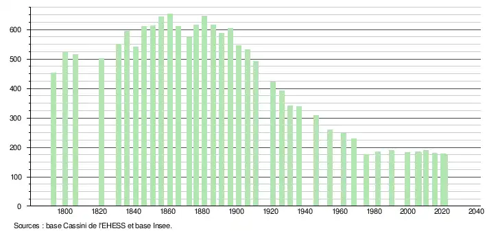 L'évolution du nombre d'habitants est connue à travers les recensements de la population effectués dans la commune depuis 1793. Pour les communes de moins de 10 000 habitants, une enquête de recensement portant sur toute la population est réalisée tous les cinq ans, les populations légales des années intermédiaires étant quant à elles estimées par interpolation ou extrapolation[30]. Pour la commune, le premier recensement exhaustif entrant dans le cadre du nouveau dispositif a été réalisé en 2005[31].