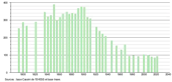 L'évolution du nombre d'habitants est connue à travers les recensements de la population effectués dans la commune depuis 1793. Pour les communes de moins de 10 000 habitants, une enquête de recensement portant sur toute la population est réalisée tous les cinq ans, les populations légales des années intermédiaires étant quant à elles estimées par interpolation ou extrapolation[16]. Pour la commune, le premier recensement exhaustif entrant dans le cadre du nouveau dispositif a été réalisé en 2007[17].