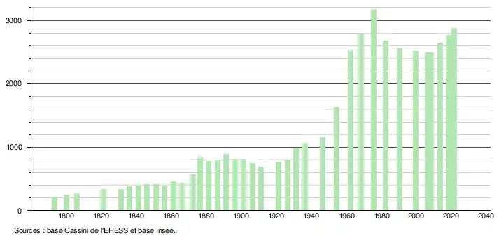 L'évolution du nombre d'habitants est connue à travers les recensements de la population effectués dans la commune depuis 1793. Pour les communes de moins de 10 000 habitants, une enquête de recensement portant sur toute la population est réalisée tous les cinq ans, les populations légales des années intermédiaires étant quant à elles estimées par interpolation ou extrapolation[23]. Pour la commune, le premier recensement exhaustif entrant dans le cadre du nouveau dispositif a été réalisé en 2008[24].