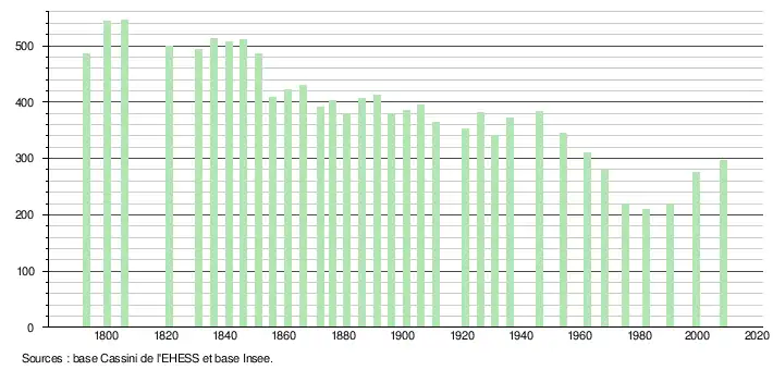 L'évolution du nombre d'habitants est connue à travers les recensements de la population effectués dans la commune depuis 1793. À partir du , les populations légales des communes sont publiées annuellement dans le cadre d'un recensement qui repose désormais sur une collecte d'information annuelle, concernant successivement tous les territoires communaux au cours d'une période de cinq ans. Pour les communes de moins de 10 000 habitants, une enquête de recensement portant sur toute la population est réalisée tous les cinq ans, les populations légales des années intermédiaires étant quant à elles estimées par interpolation ou extrapolation[9]. Pour la commune, le premier recensement exhaustif entrant dans le cadre du nouveau dispositif a été réalisé en 2008[10],[Note 1].