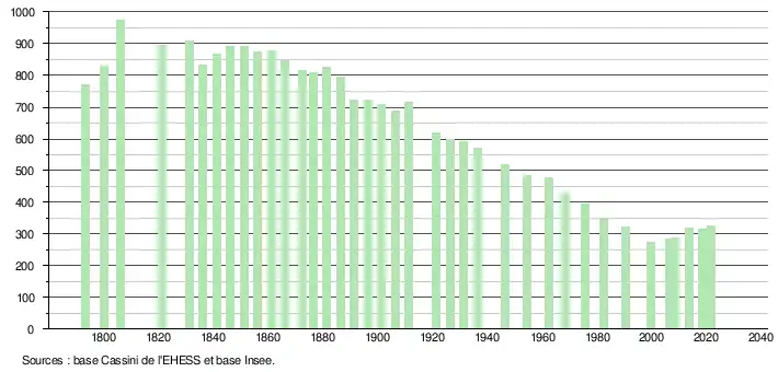 L'évolution du nombre d'habitants est connue à travers les recensements de la population effectués dans la commune depuis 1793. Pour les communes de moins de 10 000 habitants, une enquête de recensement portant sur toute la population est réalisée tous les cinq ans, les populations légales des années intermédiaires étant quant à elles estimées par interpolation ou extrapolation[18]. Pour la commune, le premier recensement exhaustif entrant dans le cadre du nouveau dispositif a été réalisé en 2008[19].