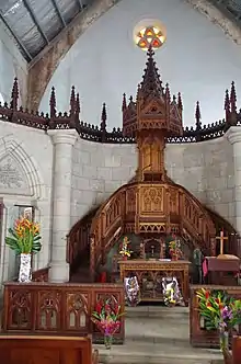 À la limite méridionale, la chaire, certainement la partie la plus décorée de l'édifice, est entièrement sculptée en bois de tamanou (bois noble endémique, assez dur, rose brun, voire rouge) par des menuisiers et ébénistes transportés[5]. Derrière la chaire, la sacristie devait initialement abriter une bibliothèque qui n'a finalement jamais été finalisée[3].