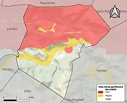 Le retrait-gonflement des sols argileux est susceptible d'engendrer des dommages importants aux bâtiments en cas d’alternance de périodes de sécheresse et de pluie. 66,2 % de la superficie communale est en aléa moyen ou fort (75,2 % au niveau départemental et 48,5 % au niveau national). Sur les 95 bâtiments dénombrés sur la commune en 2019, 78 sont en aléa moyen ou fort, soit 82 %, à comparer aux 94 % au niveau départemental et 54 % au niveau national. Une cartographie de l'exposition du territoire national au retrait gonflement des sols argileux est disponible sur le site du BRGM[29],[Carte 3].