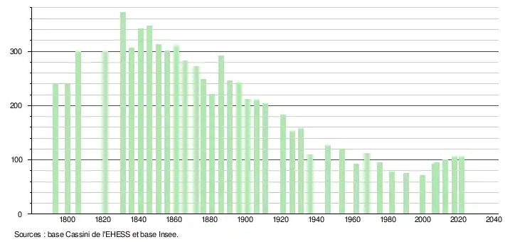 L'évolution du nombre d'habitants est connue à travers les recensements de la population effectués dans la commune depuis 1793. Pour les communes de moins de 10 000 habitants, une enquête de recensement portant sur toute la population est réalisée tous les cinq ans, les populations légales des années intermédiaires étant quant à elles estimées par interpolation ou extrapolation[32]. Pour la commune, le premier recensement exhaustif entrant dans le cadre du nouveau dispositif a été réalisé en 2007[33].