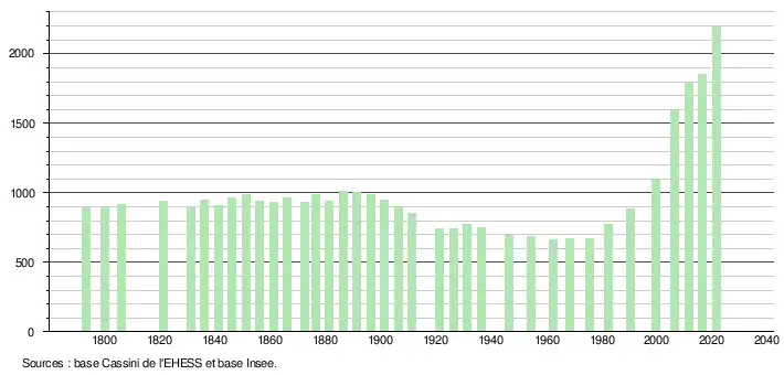 L'évolution du nombre d'habitants est connue à travers les recensements de la population effectués dans la commune depuis 1793. Pour les communes de moins de 10 000 habitants, une enquête de recensement portant sur toute la population est réalisée tous les cinq ans, les populations légales des années intermédiaires étant quant à elles estimées par interpolation ou extrapolation[24]. Pour la commune, le premier recensement exhaustif entrant dans le cadre du nouveau dispositif a été réalisé en 2006[25].