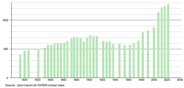L'évolution du nombre d'habitants est connue à travers les recensements de la population effectués dans la commune depuis 1793. Pour les communes de moins de 10 000 habitants, une enquête de recensement portant sur toute la population est réalisée tous les cinq ans, les populations légales des années intermédiaires étant quant à elles estimées par interpolation ou extrapolation[21]. Pour la commune, le premier recensement exhaustif entrant dans le cadre du nouveau dispositif a été réalisé en 2006[22].