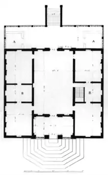 Le plan est très simple et les pièces ne sont pas parfaitement proportionnées, probablement la conséquence de l'utilisation des murs de la structure préexistante.