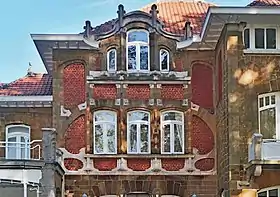 La façade asymétrique compte trois travées. La travée droite est la plus avancée et la gauche la plus en retrait. La travée centrale est richement décorée de sculptures en pierre bleue et pierre blanche formant une courbe. La travée gauche est précédée d'une terrasse ouverte surmontée d'un balcon orné de fer forgé peint en blanc. La toiture de tuiles rouges de formes et d'inclinaisons différentes comporte des pièces décoratives de plomb, une girouette et des cheminées décoratives. Les matériaux principaux des façades sont la brique rouge et le grès jaune.