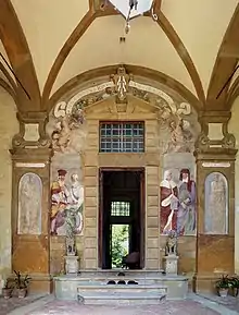 Sur le mur d'entrée s'ouvre un majestueux portail en bossage, surmonté d'une imposte quadrangulaire, sur laquelle repose un tympan qui soutient, au centre d'un motif caractéristique à trois rayons, les armoiries de Vecchietti à cinq hermines. Le portail est encadré par des fresques, que la tradition attribue à Bernardino Poccetti , mais qui plus récemment ont été attribuées[1] à Santi di Tito, un peintre dont la relation avec Bernardo Vecchietti est documentée. Au sommet, la devise dans le cartouche soutenu par de beaux chérubins ailés, est encore un jeu de mots sur le nom de la famille et de la villa. Dans la bande inférieure sont figurés quatre vieillards, qui représentent probablement des ancêtres illustres, caractérisés par des vêtements et des attributs dont la signification particulière n'est pas encore entièrement comprise; dans le deuxième personnage de la droite, qui tient un livre avec emblème, on a voulu reconnaître le même Bernard. Dans les fausses niches sur les côtés du portail sont représentées deux statues d'Hercule, surmontées d'écrits qui célèbrent le repos du héros. Les clefs des voûtes portent des fresques avec les armoiries bipartites de Vecchietti - Strozzi (la mère de Bernardo était une Strozzi[2]), et des armoiries composées d'une hermine avec la devise Candidor Animus. L'inscription sur les tabourets en pierre sur les côtés du portail fait à nouveau référence au nom de la villa.
