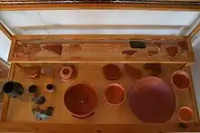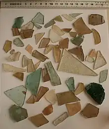 Comme le montrent les découvertes de nombreux fragments de verre, la plupart des fenêtres du complexe auraient été vitrées. Ces fragments sont généralement de couleur verdâtre ou brunâtre. Des fragments de bocaux en verre se retrouvent dans le bâtiment des bains, car ils servaient de pots à onguents.