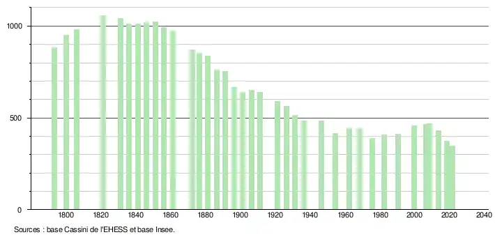 L'évolution du nombre d'habitants est connue à travers les recensements de la population effectués dans la commune depuis 1793. Pour les communes de moins de 10 000 habitants, une enquête de recensement portant sur toute la population est réalisée tous les cinq ans, les populations légales des années intermédiaires étant quant à elles estimées par interpolation ou extrapolation[16]. Pour la commune, le premier recensement exhaustif entrant dans le cadre du nouveau dispositif a été réalisé en 2008[17].