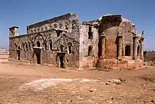 Très souvent, l'ajout de pièces latérales à l'abside semi-circulaire a été repris de l'architecture des temples romains, de sorte que l'abside était enfermée dans le bâtiment et invisible de l'extérieur, avec un chevet plat[20]. Comme pour les bâtiments résidentiels, les entrées dans les églises du massif calcaire central et septentrional se situaient du côté sud, le pignon ouest restant fermé et ne recevant de porte qu'à partir du Ve siècle. Au sud du massif, la façade ouest des églises primitives s'ouvrait par une large porte. Au cours des Ve et VIe siècles sont venues s'ajouter des basiliques à nef unique, témoignant d'un style architectural régional. Puis des églises à trois nefs avec un chœur rectangulaire au lieu de l'abside se sont développées dans la seconde moitié du Ve siècle. La dernière église de cette époque dans le nord de la Syrie et en même temps l'une des dernières de toute la Syrie est l'église Saint-Serge de Babisqa, datée de 609-610.