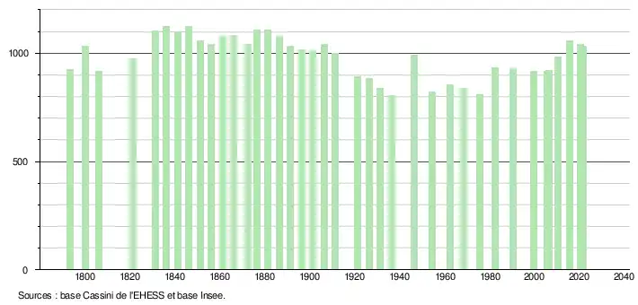 L'évolution du nombre d'habitants est connue à travers les recensements de la population effectués dans la commune depuis 1793. Pour les communes de moins de 10 000 habitants, une enquête de recensement portant sur toute la population est réalisée tous les cinq ans, les populations légales des années intermédiaires étant quant à elles estimées par interpolation ou extrapolation[27]. Pour la commune, le premier recensement exhaustif entrant dans le cadre du nouveau dispositif a été réalisé en 2005[28].