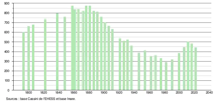 L'évolution du nombre d'habitants est connue à travers les recensements de la population effectués dans la commune depuis 1793. Pour les communes de moins de 10 000 habitants, une enquête de recensement portant sur toute la population est réalisée tous les cinq ans, les populations légales des années intermédiaires étant quant à elles estimées par interpolation ou extrapolation[10]. Pour la commune, le premier recensement exhaustif entrant dans le cadre du nouveau dispositif a été réalisé en 2006[11].