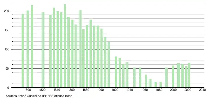 L'évolution du nombre d'habitants est connue à travers les recensements de la population effectués dans la commune depuis 1793. Pour les communes de moins de 10 000 habitants, une enquête de recensement portant sur toute la population est réalisée tous les cinq ans, les populations légales des années intermédiaires étant quant à elles estimées par interpolation ou extrapolation[29]. Pour la commune, le premier recensement exhaustif entrant dans le cadre du nouveau dispositif a été réalisé en 2007[30].