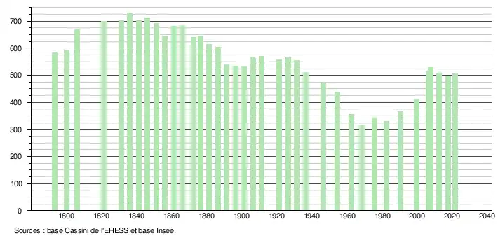 L'évolution du nombre d'habitants est connue à travers les recensements de la population effectués dans la commune depuis 1793. Pour les communes de moins de 10 000 habitants, une enquête de recensement portant sur toute la population est réalisée tous les cinq ans, les populations légales des années intermédiaires étant quant à elles estimées par interpolation ou extrapolation[29]. Pour la commune, le premier recensement exhaustif entrant dans le cadre du nouveau dispositif a été réalisé en 2007[30].