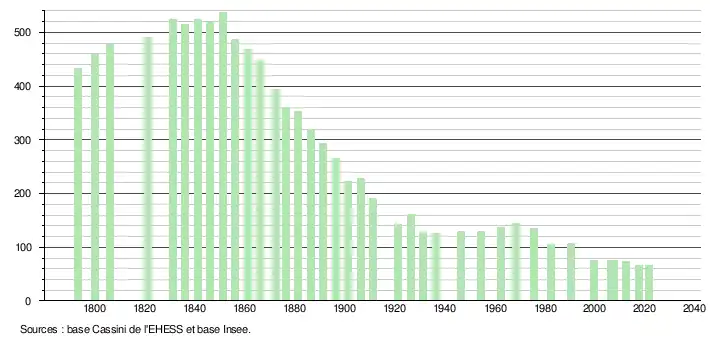 L'évolution du nombre d'habitants est connue à travers les recensements de la population effectués dans la commune depuis 1793. Pour les communes de moins de 10 000 habitants, une enquête de recensement portant sur toute la population est réalisée tous les cinq ans, les populations légales des années intermédiaires étant quant à elles estimées par interpolation ou extrapolation[14]. Pour la commune, le premier recensement exhaustif entrant dans le cadre du nouveau dispositif a été réalisé en 2007[15].