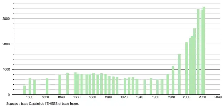 L'évolution du nombre d'habitants est connue à travers les recensements de la population effectués dans la commune depuis 1793. Pour les communes de moins de 10 000 habitants, une enquête de recensement portant sur toute la population est réalisée tous les cinq ans, les populations légales des années intermédiaires étant quant à elles estimées par interpolation ou extrapolation[19]. Pour la commune, le premier recensement exhaustif entrant dans le cadre du nouveau dispositif a été réalisé en 2004[20].
