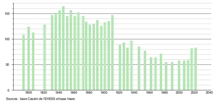 L'évolution du nombre d'habitants est connue à travers les recensements de la population effectués dans la commune depuis 1793. Pour les communes de moins de 10 000 habitants, une enquête de recensement portant sur toute la population est réalisée tous les cinq ans, les populations légales des années intermédiaires étant quant à elles estimées par interpolation ou extrapolation[22]. Pour la commune, le premier recensement exhaustif entrant dans le cadre du nouveau dispositif a été réalisé en 2006[23].