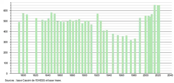 L'évolution du nombre d'habitants est connue à travers les recensements de la population effectués dans la commune depuis 1793. Pour les communes de moins de 10 000 habitants, une enquête de recensement portant sur toute la population est réalisée tous les cinq ans, les populations légales des années intermédiaires étant quant à elles estimées par interpolation ou extrapolation[30]. Pour la commune, le premier recensement exhaustif entrant dans le cadre du nouveau dispositif a été réalisé en 2004[31].
