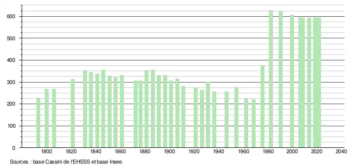 L'évolution du nombre d'habitants est connue à travers les recensements de la population effectués dans la commune depuis 1793. Pour les communes de moins de 10 000 habitants, une enquête de recensement portant sur toute la population est réalisée tous les cinq ans, les populations légales des années intermédiaires étant quant à elles estimées par interpolation ou extrapolation[15]. Pour la commune, le premier recensement exhaustif entrant dans le cadre du nouveau dispositif a été réalisé en 2008[16].