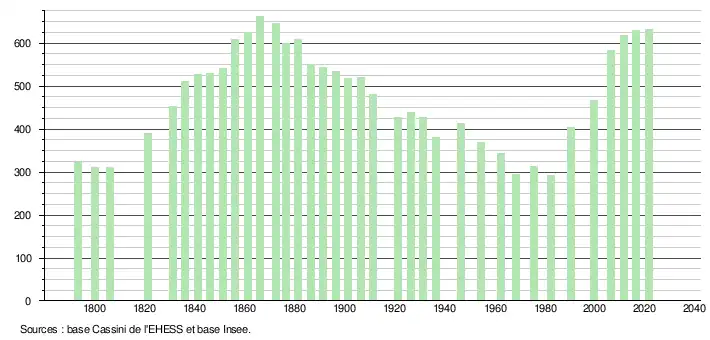 L'évolution du nombre d'habitants est connue à travers les recensements de la population effectués dans la commune depuis 1793. Pour les communes de moins de 10 000 habitants, une enquête de recensement portant sur toute la population est réalisée tous les cinq ans, les populations légales des années intermédiaires étant quant à elles estimées par interpolation ou extrapolation[17]. Pour la commune, le premier recensement exhaustif entrant dans le cadre du nouveau dispositif a été réalisé en 2006[18].