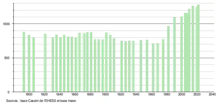 L'évolution du nombre d'habitants est connue à travers les recensements de la population effectués dans la commune depuis 1793. Pour les communes de moins de 10 000 habitants, une enquête de recensement portant sur toute la population est réalisée tous les cinq ans, les populations légales des années intermédiaires étant quant à elles estimées par interpolation ou extrapolation[21]. Pour la commune, le premier recensement exhaustif entrant dans le cadre du nouveau dispositif a été réalisé en 2004[22].