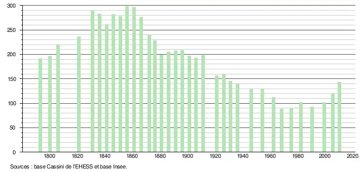 L'évolution du nombre d'habitants est connue à travers les recensements de la population effectués dans la commune depuis 1793. À partir du , les populations légales des communes sont publiées annuellement dans le cadre d'un recensement qui repose désormais sur une collecte d'information annuelle, concernant successivement tous les territoires communaux au cours d'une période de cinq ans. Pour les communes de moins de 10 000 habitants, une enquête de recensement portant sur toute la population est réalisée tous les cinq ans, les populations légales des années intermédiaires étant quant à elles estimées par interpolation ou extrapolation[1]. Pour la commune, le premier recensement exhaustif entrant dans le cadre du nouveau dispositif a été réalisé en 2005[2],[Note 1].