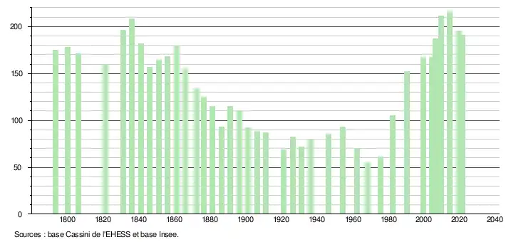 L'évolution du nombre d'habitants est connue à travers les recensements de la population effectués dans la commune depuis 1793. Pour les communes de moins de 10 000 habitants, une enquête de recensement portant sur toute la population est réalisée tous les cinq ans, les populations légales des années intermédiaires étant quant à elles estimées par interpolation ou extrapolation[22]. Pour la commune, le premier recensement exhaustif entrant dans le cadre du nouveau dispositif a été réalisé en 2004[23].