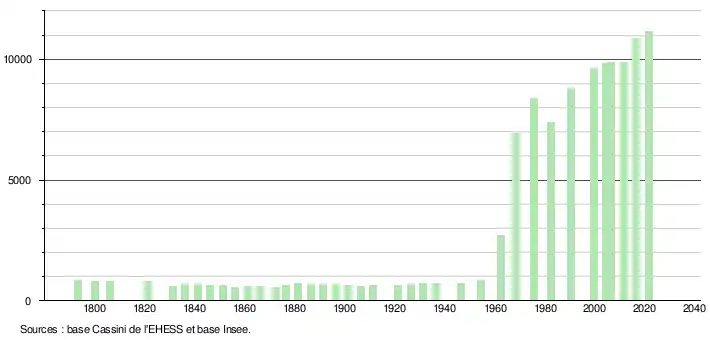 - Par convention dans Wikipédia, le principe a été retenu de n’afficher dans le tableau des recensements et le graphique, pour les populations légales postérieures à 1999, que les populations correspondant à une enquête exhaustive de recensement pour les communes de moins de 10 000 habitants, et que les populations des années 2006, 2011, 2016, etc. pour les communes de plus de 10 000 habitants, ainsi que la dernière population légale publiée par l’Insee pour l'ensemble des communes.