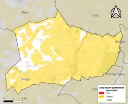 La commune est vulnérable au risque de mouvements de terrains constitué principalement du retrait-gonflement des sols argileux[15]. Cet aléa est susceptible d'engendrer des dommages importants aux bâtiments en cas d’alternance de périodes de sécheresse et de pluie. 84 % de la superficie communale est en aléa moyen ou fort (90 % au niveau départemental et 48,5 % au niveau national). Sur les 332 bâtiments dénombrés sur la commune en 2019, 328 sont en aléa moyen ou fort, soit 99 %, à comparer aux 83 % au niveau départemental et 54 % au niveau national. Une cartographie de l'exposition du territoire national au retrait gonflement des sols argileux est disponible sur le site du BRGM[16],[Carte 2].
