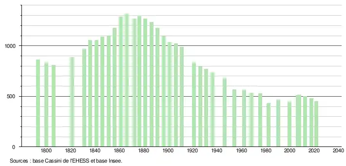 L'évolution du nombre d'habitants est connue à travers les recensements de la population effectués dans la commune depuis 1793. Pour les communes de moins de 10 000 habitants, une enquête de recensement portant sur toute la population est réalisée tous les cinq ans, les populations légales des années intermédiaires étant quant à elles estimées par interpolation ou extrapolation[29]. Pour la commune, le premier recensement exhaustif entrant dans le cadre du nouveau dispositif a été réalisé en 2007[30].